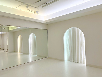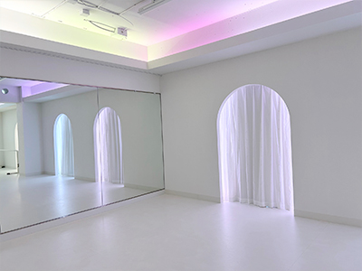 真っ白な床は、適度な弾力性と程よい硬さと安定感があります。床材のリノりウムは英国バーミンガム・ロイヤル・バレエ団でも採用されている、バレエ・舞台用を使用しています。